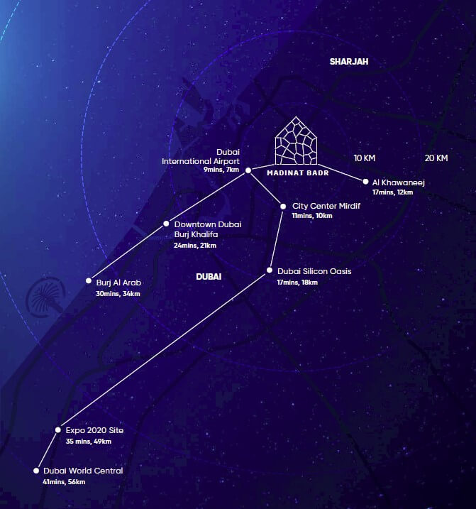 Madinat Badr is located at the intersection of Mohamed bin Zayed Road and Al Khawaneej Road, in Mirdiff. It is just minutes from Dubai International Airport and the major attractions of the city.